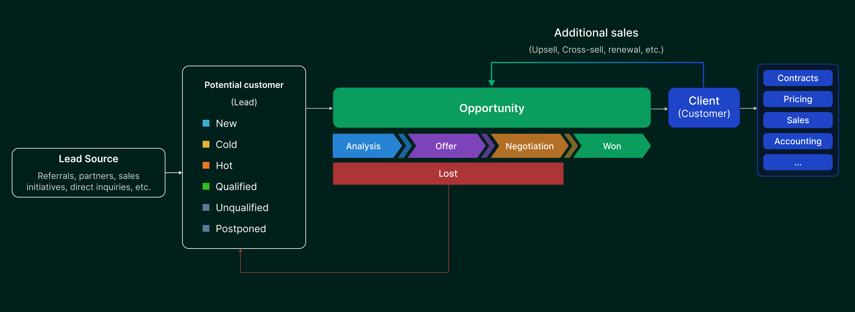 The CRM solution integrates the entire sales and accounting process — from the first contact to long‑term collaboration, including all accounting data. Clear stages, product, service, client, debt, payment and other key information, along with automated actions, enable the team to work faster, more accurately, and more efficiently.
